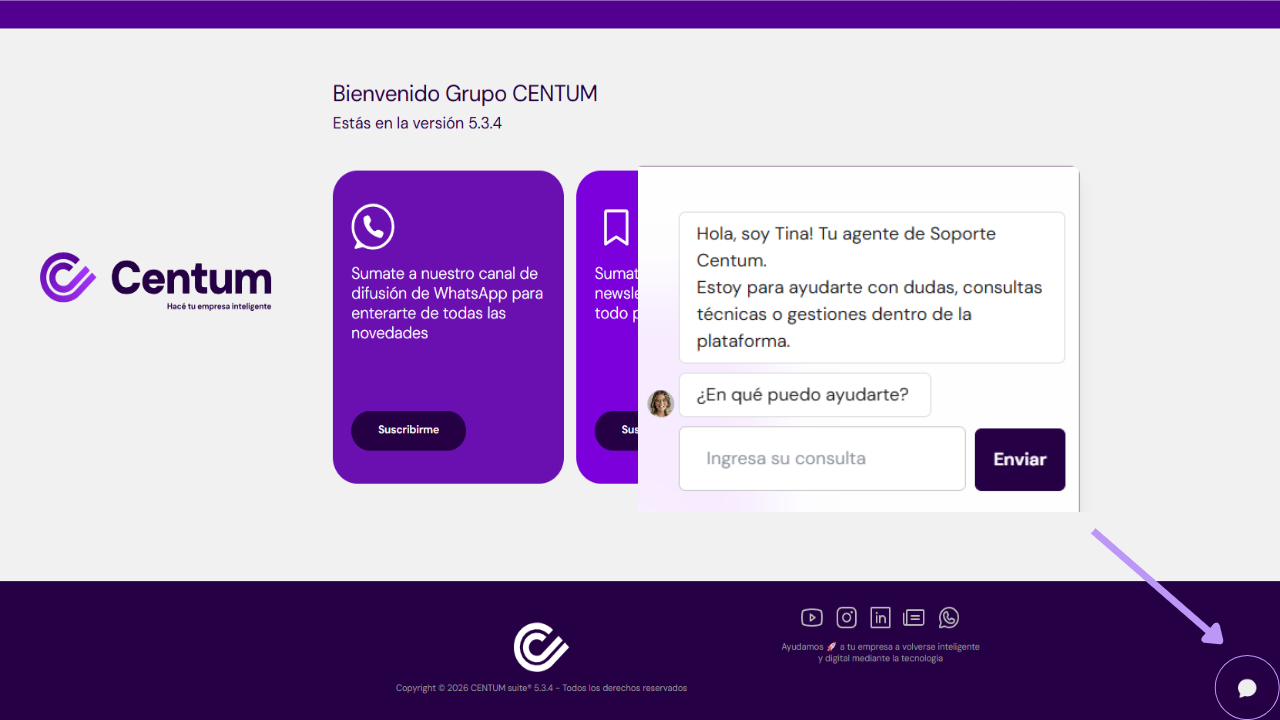 El acceso es simple y directo.Cada usuario de Centum puede utilizar el agente de soporte ingresando a la plataforma con su usuario y contraseña. Dentro de la interfaz, en la parte inferior derecha, está disponible el ícono de chat para iniciar la conversación con Tina.