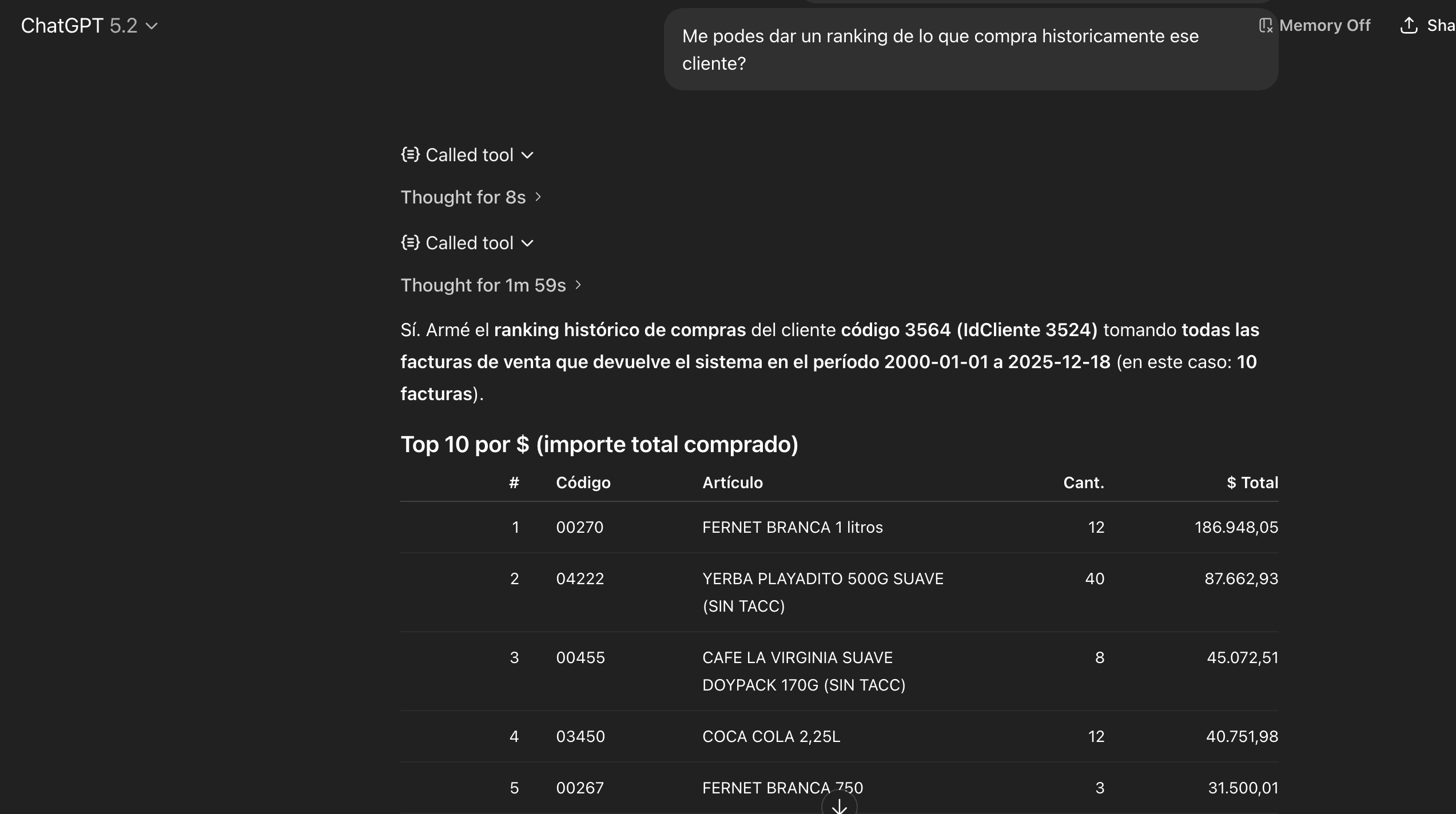 - “¿Me podés dar el ranking de lo que comprar X cliente?”