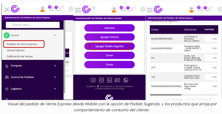 Otra herramienta que aporta valor a la relación con el cliente es el pedido sugerido. A partir del historial de compra, el sistema puede sugerir productos que el cliente suele llevar o que son compatibles con su patrón de consumo.