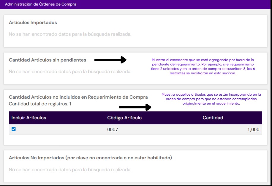 - detectar artículos que no estén en el requerimiento o cantidades mayores a las pendientes y permitir incluir esos artículos igualmente